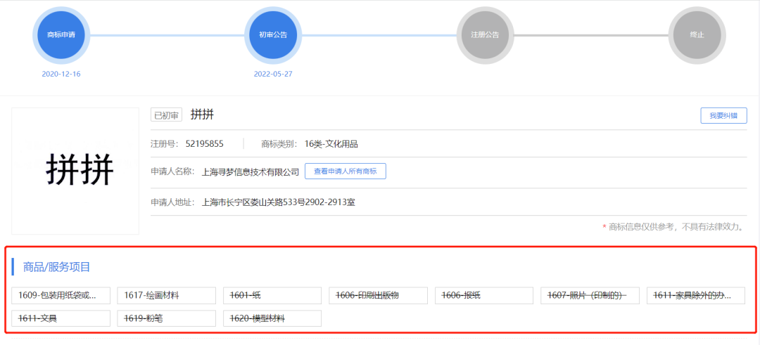 也就是說,“拼拼”商標(biāo)指定使用于“繪畫材料;包裝用紙或塑料袋(信封、小袋)”商品上的予以初步審定,而指定使用于“紙;印刷出版物;報紙;照片(印制的);家具除外的辦公必需品;文具”商品上的予以駁回!