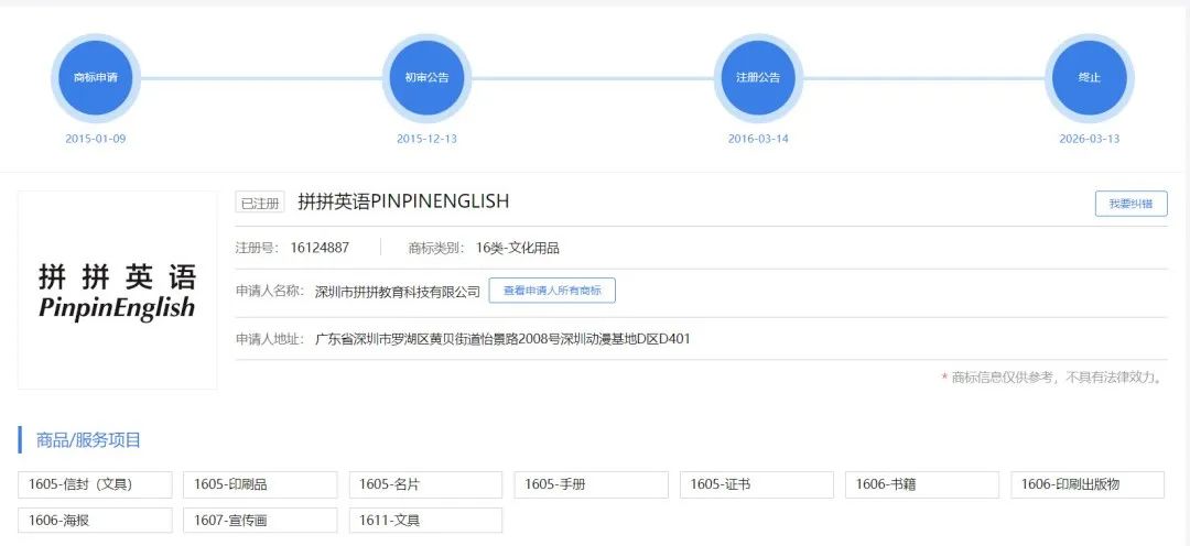 這件“拼拼英語PINPINENGLISH”商標(biāo)由深圳市拼拼教育科技有限公司于2015年1月申請,2016年3月獲準(zhǔn)注冊,注冊類別也是16類的“印刷品;文具”等商品。