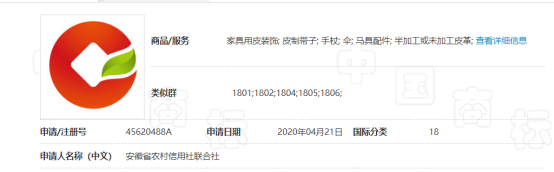 因認為安徽省農(nóng)村信用社聯(lián)合社的一枚圖形商標(第45620488A號)與其商標近似且侵犯其著作權,在該商標公告期內(nèi),中國建設銀行股份有限公司對其提出異議請求。商標局審理認為:被異議商標指定使用商品與異議人引證商標核定使用服務不屬于類似商品或服務,因此雙方商標未構(gòu)成使用于類似商品或服務上的近似商標。但被異議人將與異議人享有著作權的作品相近似的圖案作為商標申請注冊,已構(gòu)成對異議人著作權的損害,故商標局決定:第45620488A號“圖形”商標不予注冊。小編查詢,目前該枚商標進入不予注冊復審流程。
