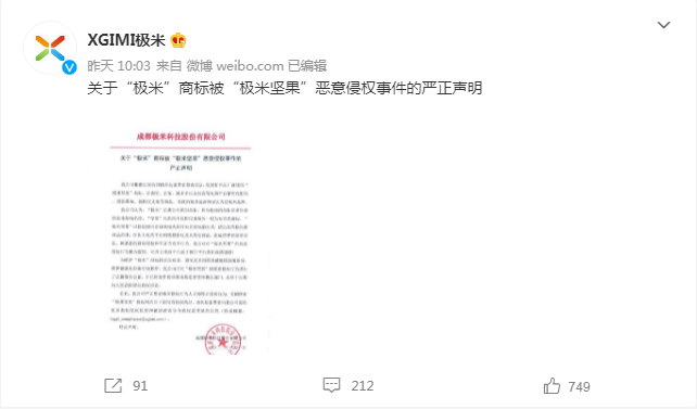 8月1日,極米通過官方平臺,發(fā)布了一則《關(guān)于“極米”商標(biāo)被“極米堅果”惡意侵權(quán)事件》的嚴(yán)正聲明。作為國內(nèi)投影儀行業(yè)的領(lǐng)頭羊企業(yè),極米的聲明立即引發(fā)廣大網(wǎng)友的關(guān)注。