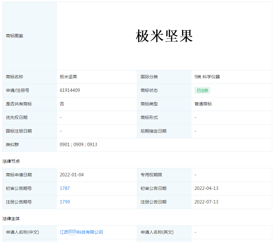 通過查詢發(fā)現(xiàn),涉及投影儀的第9類“極米堅果”商標(biāo)在2022年1月4日被江西某科技公司申請注冊,并于7月13日注冊完成,另外,該公司還對“極米堅果”商標(biāo)進(jìn)行了大量布局,幾乎覆蓋了所有類別,而這也是某電商平臺審核通過的重要原因。