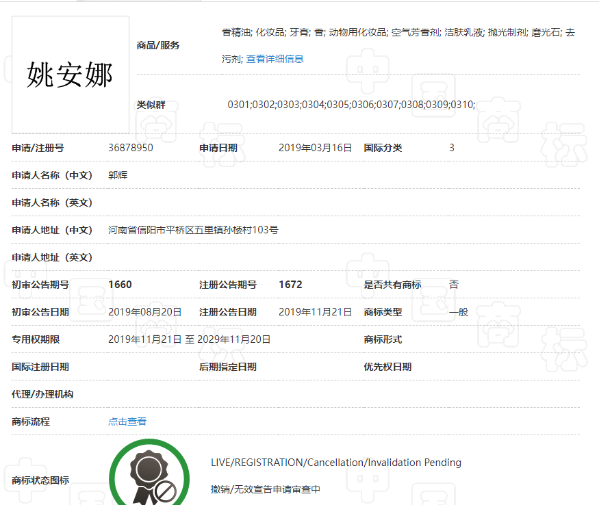 第36878950號“姚安娜”商標無效宣告案。嚴厲打擊損害公眾人物姓名權(包括本名、藝名、譯名、別名)或其他不正當手段取得注冊。