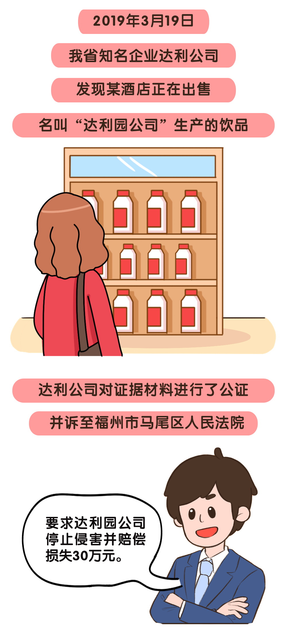 根據(jù)《中華人民共和國反不正當(dāng)競(jìng)爭(zhēng)法》第十七條和《最高人民法院關(guān)于審理注冊(cè)商標(biāo)、企業(yè)名稱與在先權(quán)利沖突的民事糾紛案件若干問題的規(guī)定》中第四條規(guī)定,馬尾法院判決:達(dá)利園公司應(yīng)停止在其生產(chǎn)、銷售的飲品包裝袋上使用 “福州達(dá)利園”字樣,停止在企業(yè)名稱中使用含有“達(dá)利園”的字號(hào),停止在飲品的內(nèi)外包裝、展會(huì)上使用帶有“達(dá)利園”字樣的企業(yè)名稱,并賠償達(dá)利公司經(jīng)濟(jì)損失和合理費(fèi)用20萬元。