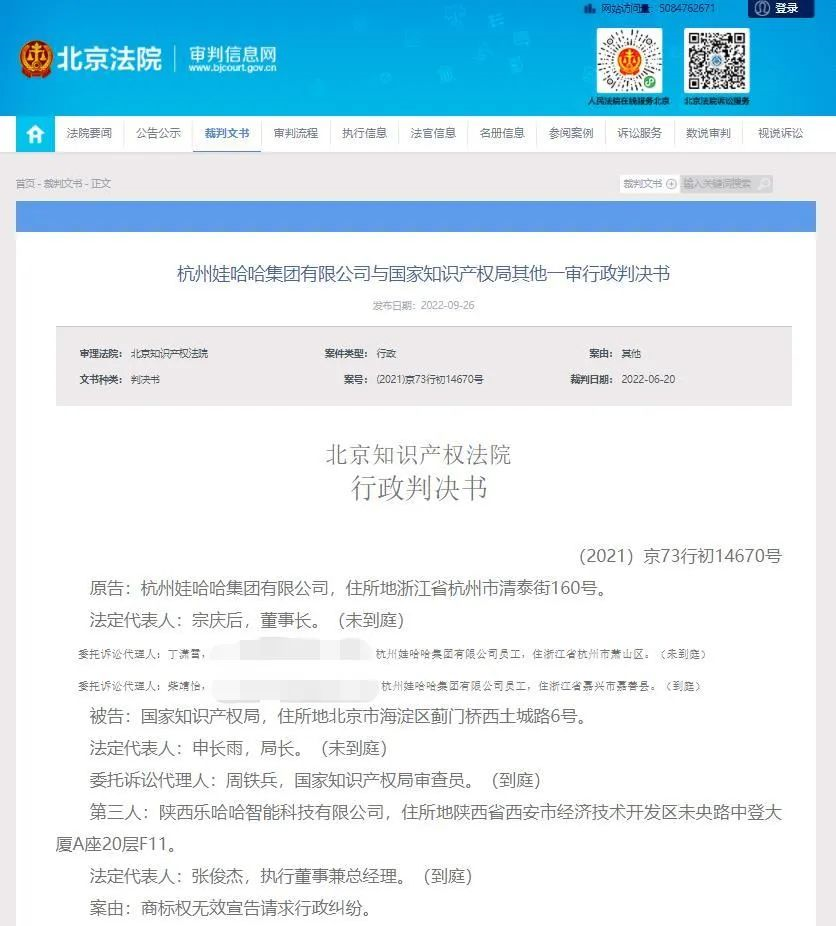 9月26日,北京法院審判信息網(wǎng)公布了杭州娃哈哈集團(tuán)有限公司與國(guó)家知識(shí)產(chǎn)權(quán)局相關(guān)案件一審法律文書(shū)。