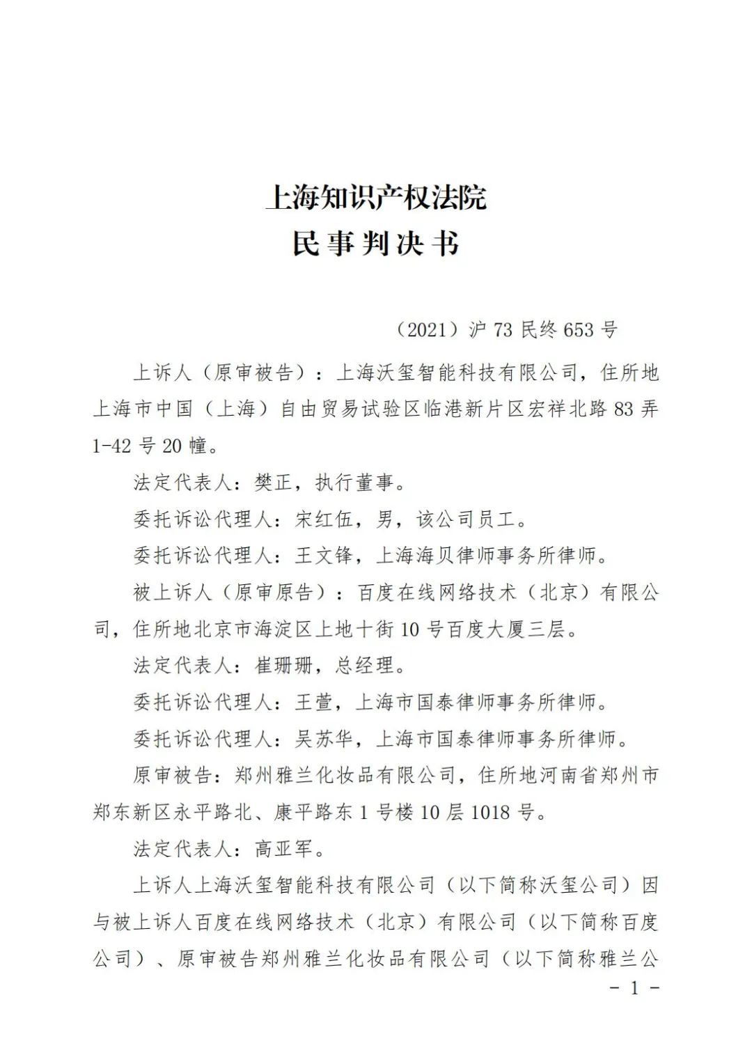 近日,深可信獲悉,上海知識(shí)產(chǎn)權(quán)法院(以下簡(jiǎn)稱上海知產(chǎn)法院)就上訴人上海沃璽智能科技有限公司(以下簡(jiǎn)稱沃璽公司)因與被上訴人百度在線網(wǎng)絡(luò)技術(shù)(北京)有限公司(以下簡(jiǎn)稱百度公司)、原審被告鄭州雅蘭化妝品有限公司(以下簡(jiǎn)稱雅蘭公司)侵害商標(biāo)權(quán)及虛假宣傳糾紛一案作出判決,駁回沃璽公司上訴,維持原判。