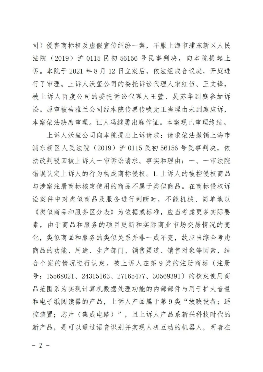 被上訴人百度公司辯稱,上訴人的行為構(gòu)成商標(biāo)侵權(quán)、不正當(dāng)競(jìng)爭(zhēng),一審判決合理。1、上訴人構(gòu)成商標(biāo)侵權(quán)。上訴人將小度、小度機(jī)器人作為商品名稱使用,是為了指示商品來源,是典型的商標(biāo)性使用。被上訴人的涉案注冊(cè)商標(biāo)的注冊(cè)時(shí)間均早于上訴人使用涉案商標(biāo)的時(shí)間,不存在上訴人所稱的在先使用,上訴人的商標(biāo)侵權(quán)的主觀惡意明顯。2、上訴人構(gòu)成不正當(dāng)競(jìng)爭(zhēng)。上訴人宣稱其是小度機(jī)器創(chuàng)始人、百度AI合作伙伴等都是虛假宣傳,其如何宣傳其小沃機(jī)器人與本案無關(guān)。3、一審判決金額應(yīng)維持,上訴人不僅是銷售商,也是生產(chǎn)商。被上訴人從有限渠道得知上訴人獲利數(shù)額起碼3億,且系獨(dú)角獸企業(yè),故一審判決金額不高,也不足以彌補(bǔ)被上訴人損失。綜上,請(qǐng)求二審法院駁回上訴請(qǐng)求,維持原判。