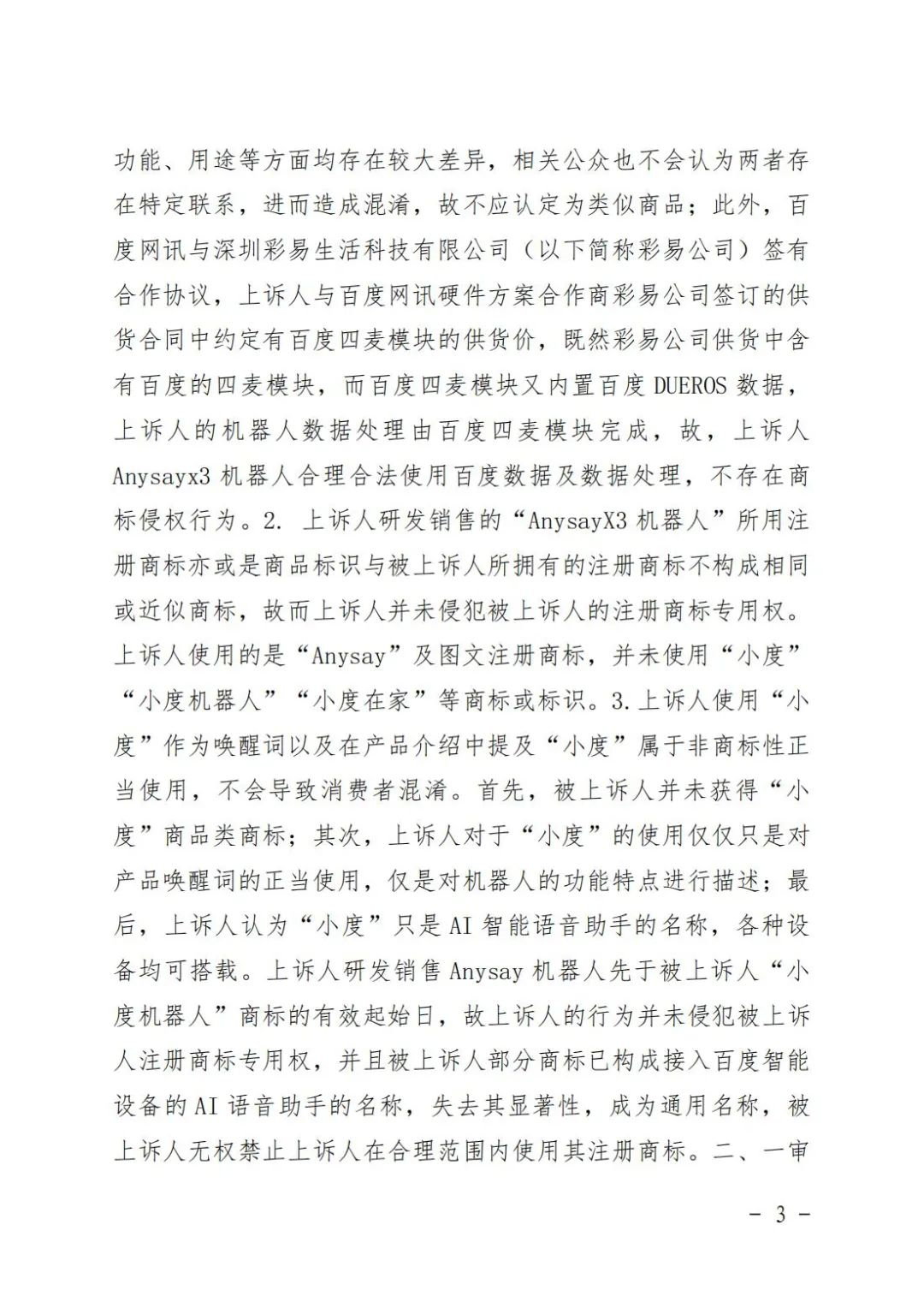 事實(shí)和理由:一、一審法院錯(cuò)誤認(rèn)定上訴人的行為構(gòu)成商標(biāo)侵權(quán)。1.上訴人的被控侵權(quán)商品與涉案注冊(cè)商標(biāo)核定使用的商品不屬于類似商品。2.上訴人研發(fā)銷售的“AnysayX3機(jī)器人”所用注冊(cè)商標(biāo)亦或是商品標(biāo)識(shí)與被上訴人所擁有的注冊(cè)商標(biāo)不構(gòu)成相同或近似商標(biāo),故而上訴人并未侵犯被上訴人的注冊(cè)商標(biāo)專用權(quán)。3.上訴人使用“小度”作為喚醒詞以及在產(chǎn)品介紹中提及“小度”屬于非商標(biāo)性正當(dāng)使用,不會(huì)導(dǎo)致消費(fèi)者混淆。