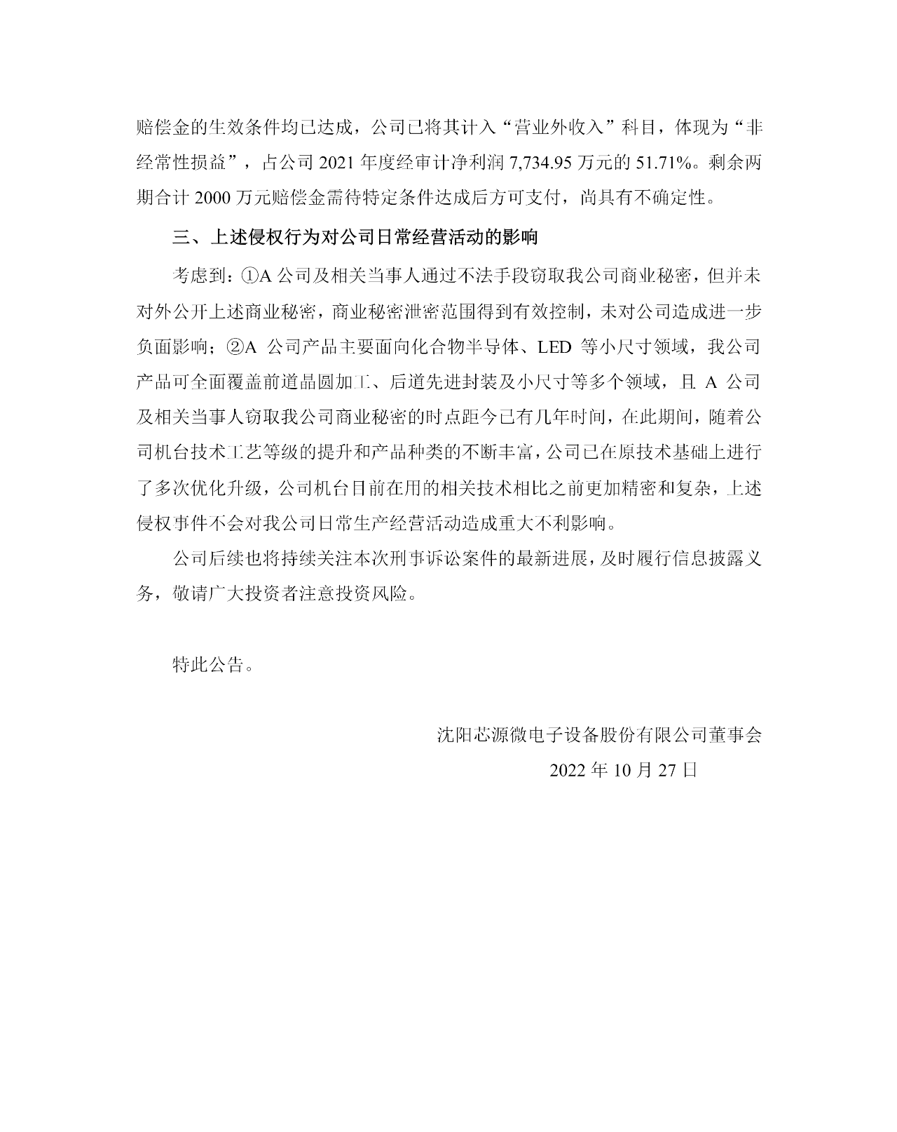 在與客戶日常合作過(guò)程中,公司發(fā)現(xiàn)A公司所售部分機(jī)臺(tái)涉嫌侵犯公司商業(yè)秘密。公司于2020年10月向沈陽(yáng)市公安局刑事報(bào)案并于當(dāng)年12月獲得受理,后經(jīng)公安機(jī)關(guān)立案?jìng)刹榻K結(jié)后移交檢察機(jī)關(guān)審查起訴。