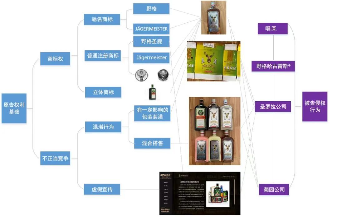 原告發(fā)現(xiàn),被告圣羅拉公司在其生產(chǎn)和銷(xiāo)售的利口酒酒瓶標(biāo)簽、瓶蓋上使用了“野格哈古雷斯”“鹿頭圖形”“YEGO HUNTER”等標(biāo)識(shí),在其官網(wǎng)上使用“野格哈古雷斯”“野格”“野格守獵者”等商標(biāo),侵犯了原告的注冊(cè)商標(biāo)專(zhuān)用權(quán)。被告圣羅拉公司使用了與原告有一定影響的包裝裝潢相同或者近似的包裝裝潢,使用“德國(guó)野格圣鹿集團(tuán)有限公司”的名義,引人誤認(rèn)為被控侵權(quán)產(chǎn)品是原告商品或與原告存在特定聯(lián)系,構(gòu)成不正當(dāng)競(jìng)爭(zhēng)。而三被告則主張其使用的系其自有注冊(cè)商標(biāo),即被告唱某注冊(cè)的第31027236號(hào)“野格哈古雷斯”商標(biāo),并未侵犯原告商標(biāo)權(quán)。