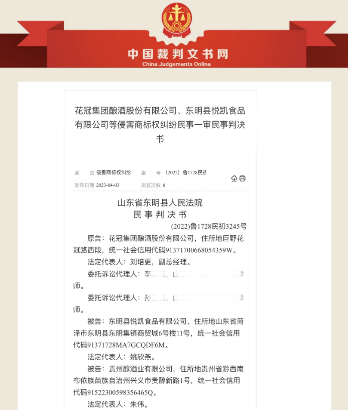 4月3日,據(jù)中國裁判文書網(wǎng)了解到,山東省東明縣人民法院對貴州醇酒業(yè)有限公司侵犯花冠公司系列“金貴”注冊商標專用權(quán)的侵權(quán)行為做出判決,貴州醇酒業(yè)有限公司因侵害商標權(quán)被罰15萬元。
