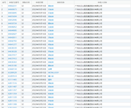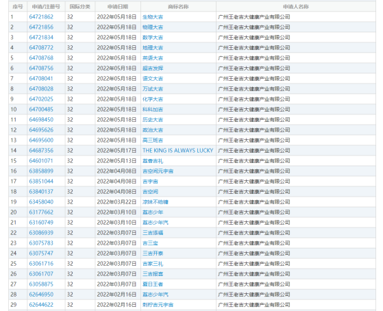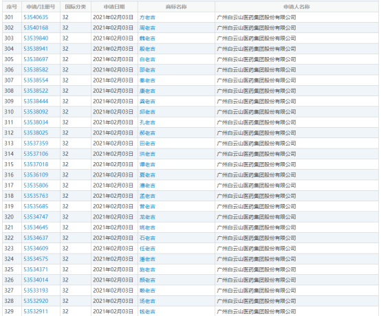有這么多花樣的產(chǎn)品,當(dāng)然離不開知識產(chǎn)權(quán)的保護(hù),王老吉也確實(shí)在這方面方面下足了功夫。在國家知識產(chǎn)權(quán)局官網(wǎng)上可查詢,王老吉的關(guān)聯(lián)公司廣州白云山醫(yī)藥集團(tuán)股份有限公司從2021年2月份就開始申請了百家姓老吉商標(biāo),為產(chǎn)品做好了商標(biāo)布局。