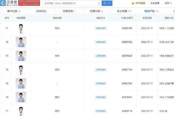 企查查 APP 顯示,近日,東方優(yōu)選(北京)科技有限公司申請注冊多個東方臻選直播間主播肖像商標,包括 " 董宇輝、孫佳琦、孫楚涵 " 等人肖像。據(jù)悉,這些商標的國際分類包含教育娛樂、廣告銷售、農(nóng)林生鮮、辦公用品等,目前商標進度為:注冊申請中。
