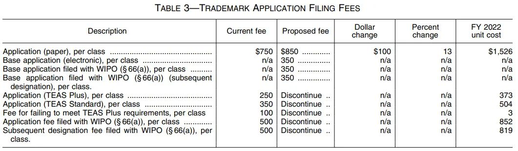 其中,規(guī)范申請(TEAS Plus)和非規(guī)范申請(TEAS Standard),將統(tǒng)一調整為350美元/類。相當于每類美標的成本都要增加100美元,漲幅高達40%。此外,美國專利商標局提議使用一個單一的電子申請?zhí)峤贿x項,將不再區(qū)分規(guī)范申請(TEAS Plus)和非規(guī)范申請(TEAS Standard)。