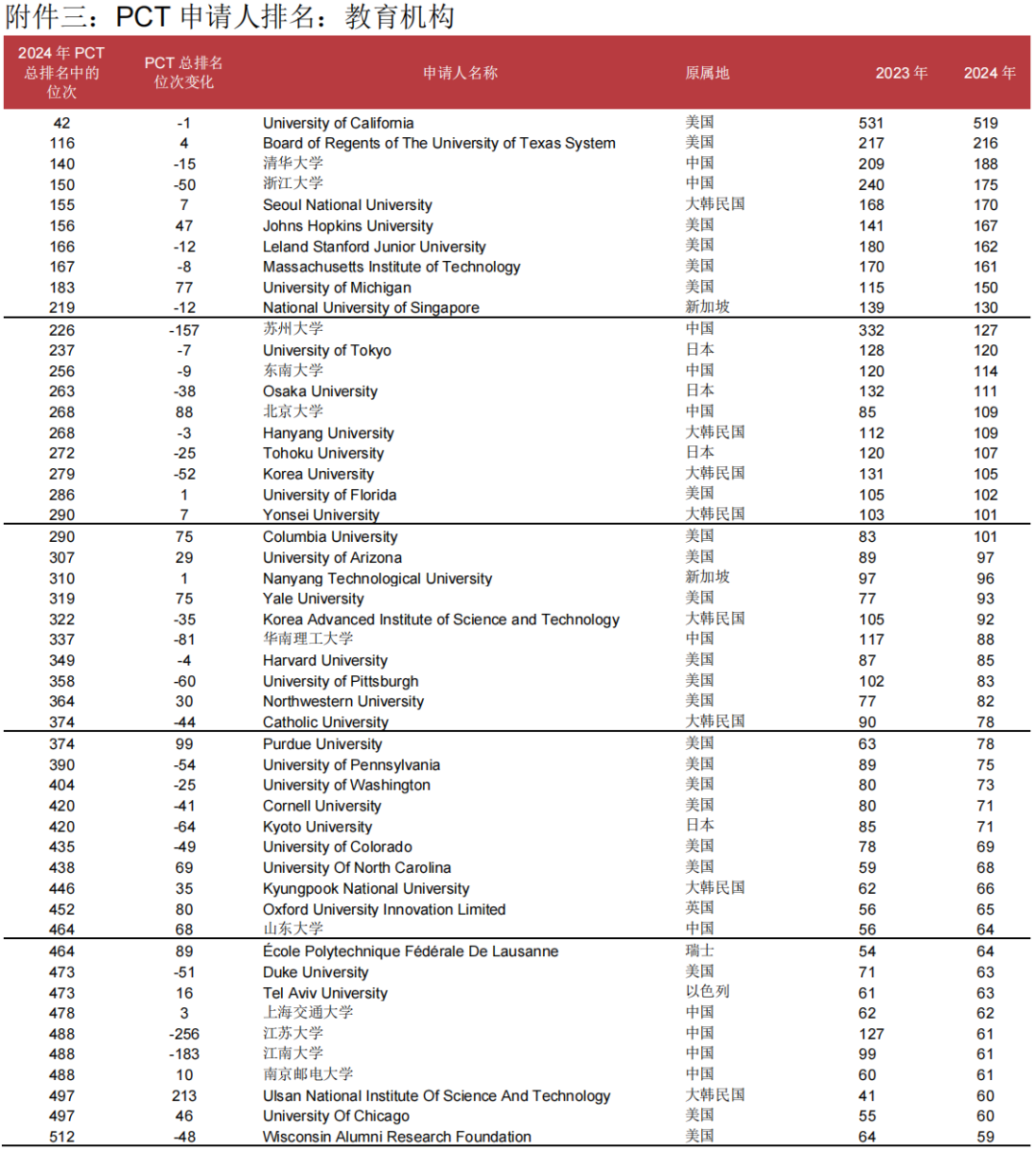 在教育領(lǐng)域,加利福尼亞大學(xué)(美國(guó))在2024年以519件PCT申請(qǐng)繼續(xù)位居榜首。德克薩斯大學(xué)系統(tǒng)(美國(guó))以216件申請(qǐng)位居第二,隨后是清華大學(xué)(中國(guó),188件)、浙江大學(xué)(中國(guó),175件)和首爾國(guó)立大學(xué)(大韓民國(guó),170件)。