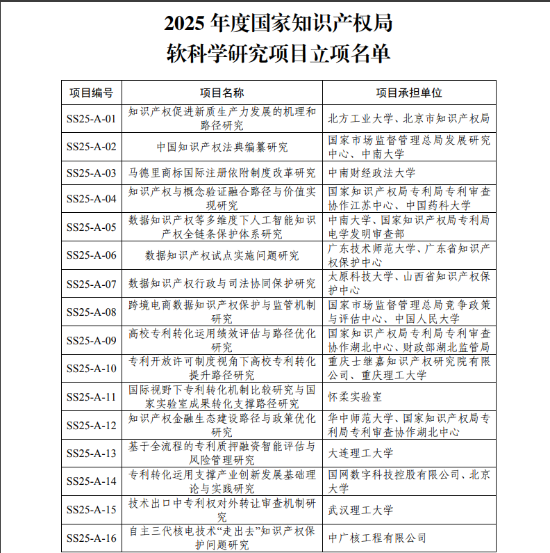 國(guó)家知識(shí)產(chǎn)權(quán)局辦公室關(guān)于印發(fā)2025年度軟科學(xué)研究項(xiàng)目立項(xiàng)名單的通知